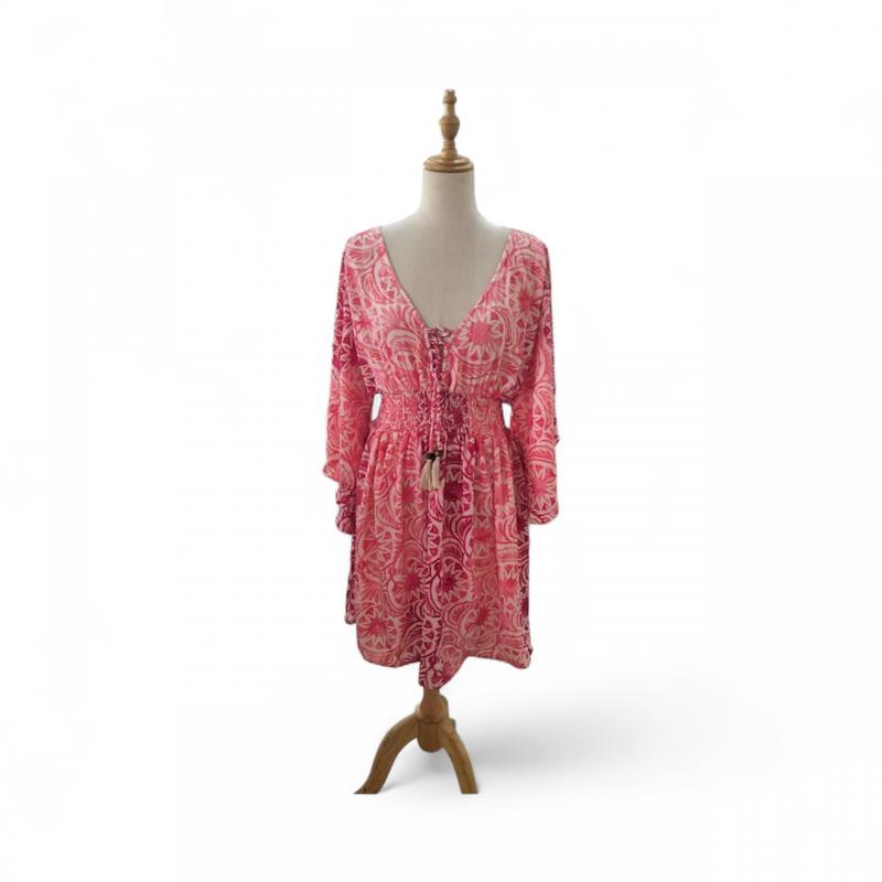 Bohemian Vintage Patch print  V neck  bell sleeve  red  floral   Tunic Dress