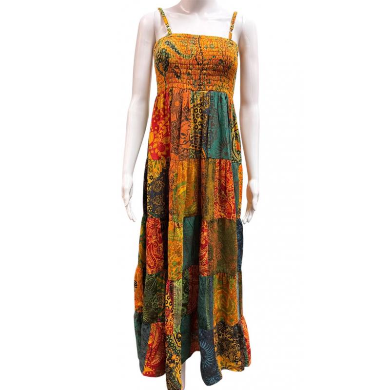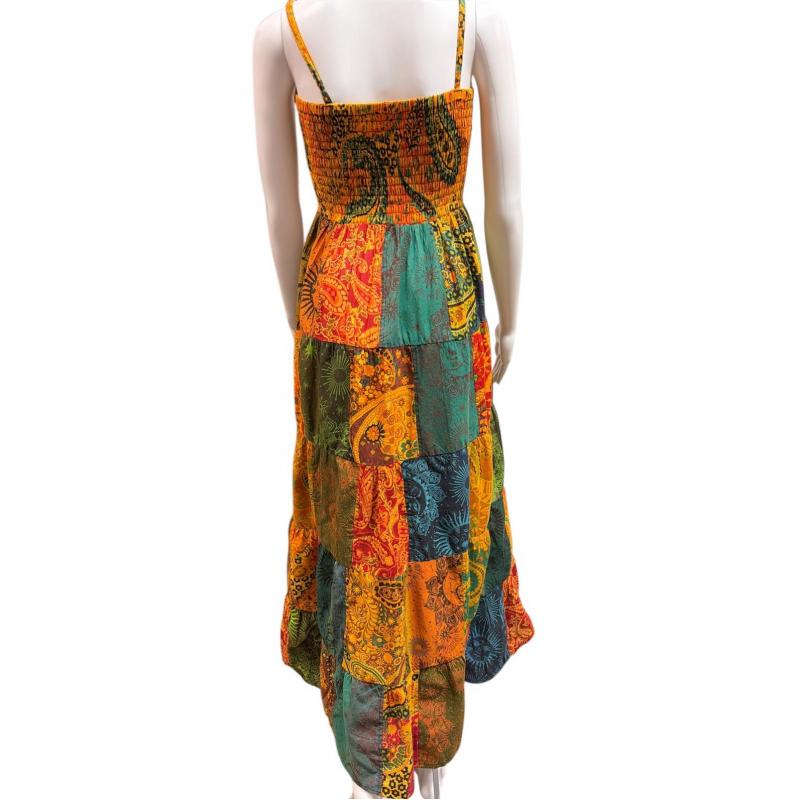 Cotton Multi Color Patchwork Boho Spaghetti Strap Bobbin Smocked Dress